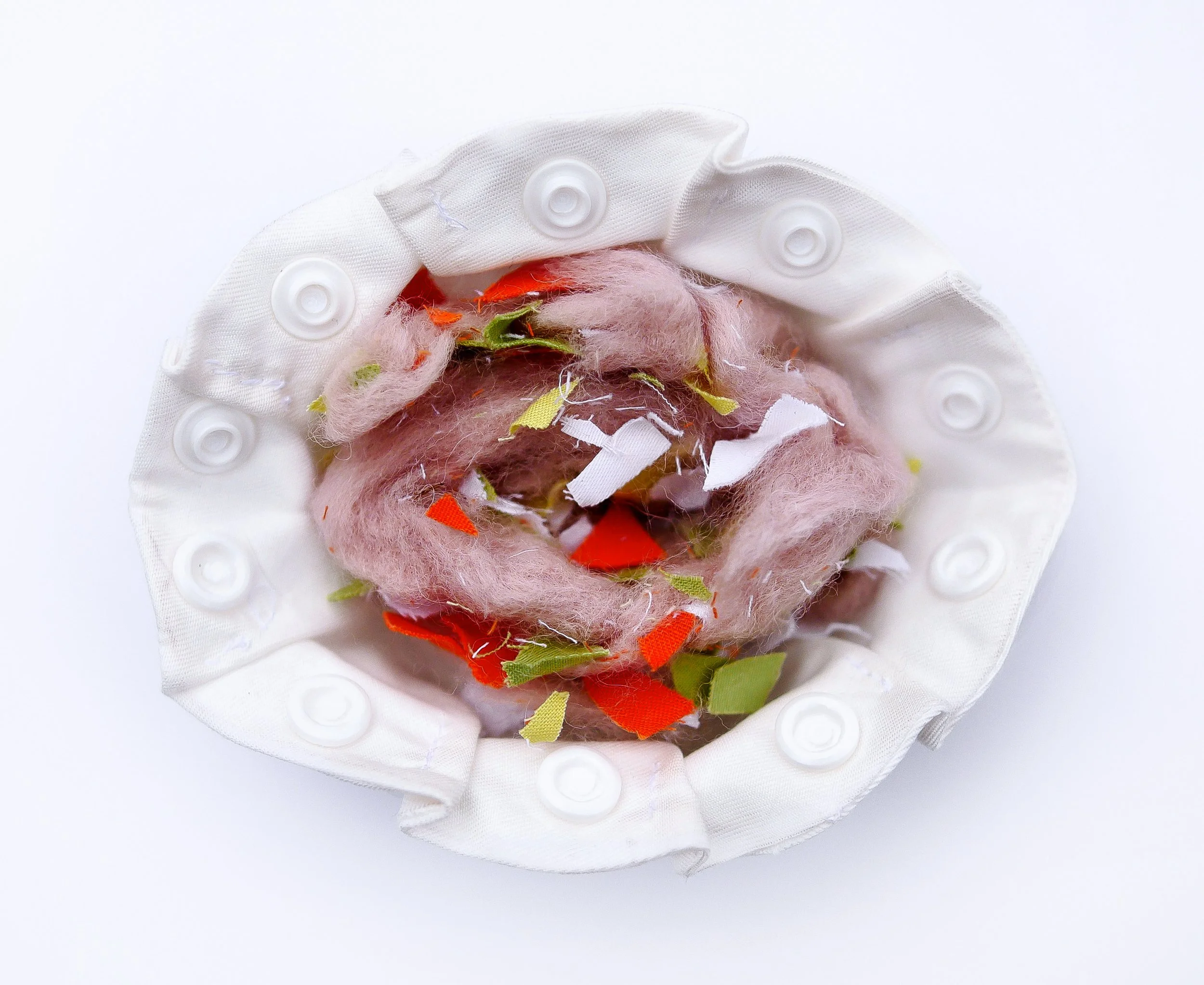 Dumpling wrapper in its folded shape, wool stuffing with “veggie” fabric pieces